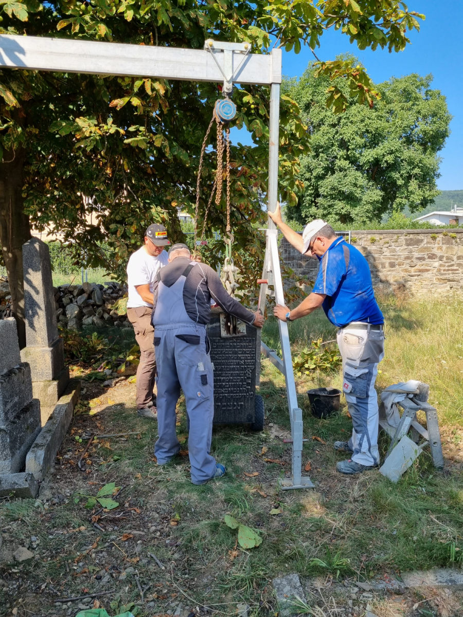 Am Samstag, 30.07.2022 waren wieder fünf Steinhauer vor Ort. Klaus Hilger, Georg „Schosch“ Müller , Egon Schumacher, Johannes „Horschel“ Montermann und Helmut Reuter. Sie haben heute zwar nur drei Grabmale gemacht, da die Steine dreiteilig waren. Leider ist ein Grabmal beim Abbau auseinander gebrochen und konnte nur das Unterteil gesetzt werden. Die Schrifttafel und das Oberteil müssen nun wieder zusammen geklebt werden. Ein Grabmal war schon in mehre Teile gebrochen und wurde aufwendig mit Schraubzwingen wieder zusammen gesetzt werden. Einige Gräber hat Schosch wieder mit Muttererde befüllt. Ein, in der Nachbarschaft, Arbeitetender, hat uns mit dem Radlader Muttererde auf den Friedhof gebracht, somit müssen wir zukünftig nicht mehr mit der Schubkarre die Muttererde von einem 500 m entfernten Erdhügel anfahren.