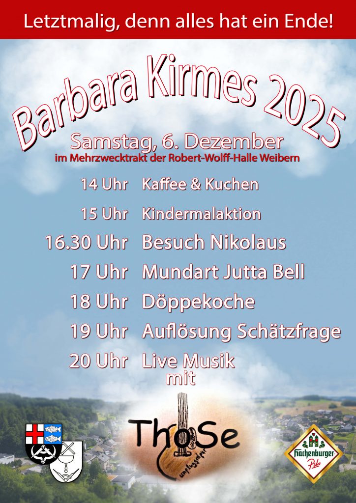 Zum sechsten Mal Mundart auf der Barbara Kirmes in Weibern. Waren 2023 nur 3 Künstler/-innen am Start, so waren es diesmal 5 Mundartler. Nachdem die Besucher sich bei Kaffee und Kuchen gestärkt hatten, ging es dann pünktlich um 16 Uhr los. Den Anfang machte Sandra Schneider aus Dedenbach. Mit selbstkomponierten Liedern, mit der Gitarre vorgetragen, brachte sie schnell den Saal in Stimmung. Dann folgte das Urgestein der Weiberner Mundart, der 89-jährige Manfred Dahm. Eher nachdenklich sein Vortrag „Et wierd nimmie esu sein, bi et ääs woe“. Als dritte Protagonistin folgte eine Newcomerin auf unserer Bühne, Sabine Stawowski. Geboren in der Nähe von Ost-Berlin lebt sie heute im schönen Eifeldorf Weibern. Die Berliner Schnauze berichtete über Schönheit und Gesundheit. Als vorletzter Künstler erschien Reinhards Jong, Rudolf Reinhard aus Niederzissen. Der Weiberner Jung hatte passend zur Adventszeit „Von jedem jett“ zu berichten. Den Abschluss der Mundartvorträge machte wie immer et Jeckisch Jutta, Jutta Bell aus Kempenich. Die in Weibern geborene Jutta versteht es, dass sich ihr Publikum zu wahren Begeisterungsstürmen hinreißen lässt. Ihr Thema „Eine Frau auf der Schwelle zum Greisenalter“ traf wohl bei manchem Besucher den richtigen Nerv, denn seien wir ehrlich, bei jedem blättert mehr oder weniger der Lack. Beim obligatorischen Abschlussfoto auf der Bühne, spendeten die Zuschauer tosenden Applaus und die Steinhauer bedankten sich bei den Künstlern mit einem kleinen Präsent. Der nun bereitgestellte Döppekooche wartete auf die hungrigen Besucher und alle 150 Portionen gingen weg. Hier ein Dank an das Seniorenzentrum Elisabethhaus für die Zubereitung. Anschließend startete die Verlosung, wobei diesmal 110 Preise auf 1.800 Lose entfallen sind. Pünktlich um 20.30 Uhr spielte dann MAJOR auf. Die Band um Frontfrau Ronja Moll, Keyboarder Joschka Moll, Schlagzeuger Andreas Auteri, Bassist Maxi Auteri sowie Gittarist Nils Zimmerstädt begeisterte bereits mit dem ersten Song die Zuhörer. Man muss feststellen, dass nach der Verlosung das Publikum wechselt, die ältere Generation macht der jüngeren Generation Platz, wobei aber auch Ältere der Musik der Band lauschten. Wann der letzte Besucher die Veranstaltung verlassen hat, ist leider nicht mehr feststellbar, es war aber noch nicht hell draußen. Während all den Stunden sorgte wieder der Hachenburger Hopfomat jederzeit für Abkühlung. Ein Dank gilt allen, die diese Veranstaltung möglich gemacht haben, Dienste übernommen, Auf- und Abbau, Vor- und Nachbereitung, Markus Hilger für die Fotos, Günter Schmidt für die Filmaufnahmen, Alfred Engel für die Deko, Kuchen- und Sachpreisspenden und natürlich den Künstlern. Ein besonderer Dank an das Organisationsteam – Hut ab. So sehen wir uns hoffentlich im Jahr 2025 wieder, wenn es dann heißt „Et siwente Moal wieed Platt jeschwatt op de Barbara Kermes ze Weiwe“.