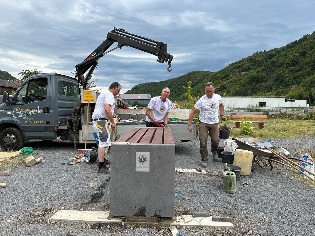Die Vertreter der Lions aus Koblenz und Vallendar, die eigens für die Ahrtal-Hilfe eine Blaulichtgruppe eingerichtet haben, waren beim Aufbau dabei. Bernhard Sommer, Jürgen Kuhn, Peter Bäsch, Günter Hilger u. Jürgen Scholz ließen es sich nicht nehmen die Steinhauer Weibern mit Manfred Nürenberg, Egon Schumacher u. Helmut Reuter vor Ort in Rech zu unterstützen. Sie wollten dabei sein, wenn die die erste Tischgruppe vor Ort fertiggestellt wird. Sie kannten das Projekt nur aus Zeichnungen und Herstellungsfotos aus den Berichten des Steinhauervereins und waren vom Endprodukt vor Ort mehr als begeistert. Alle beteiligten hoffen nun das die Sitzgruppe von Einheimischen in der Gemeinschaft zum Plausch genutzt wird und die Touristen an der Ahr hier ihre Freude haben, wenn eine kurze Wanderpause eingelegt wird. Nach den Sommerferien sind weitere Tischgruppen in Dernau und Mariental geplant zum Aufbau.