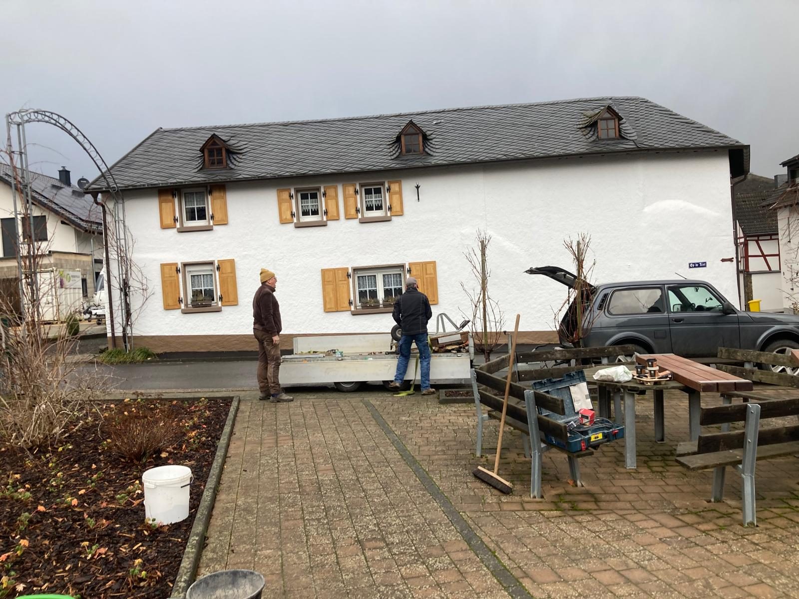 Rechtzeitig vor Weihnachten haben am Montag, 23.12.2024 der Steinhauerverein Weibern die letzte Sitzgelegenheit in Dernau aufgestellt. Damit ist nun die letzte von fünf (neben Rech, Marienthal, Kalenborn und Mayschoß-Saffenburg) Sitzgelegenheiten fertiggestellt. Neben den drei Steinhauern vor Ort gilt ein besonderer Dank an Manfred Nürenberg, der 80% der Bänke bearbeitet hat, Hermann Hilger für seine Unterstützung bei der Vorbereitung, sowie Horst Perk und sein Mitarbeiter Chris für die Bearbeitung der Hölzer. Nicht zu vergessen die Hände, die temporär zum Einsatz kamen und unterstützt haben. Gleichzeitig ist damit das Projekt, welches vom Lions Club Koblenz initiiert und finanziert wurde, erfolgreich abgeschlossen.