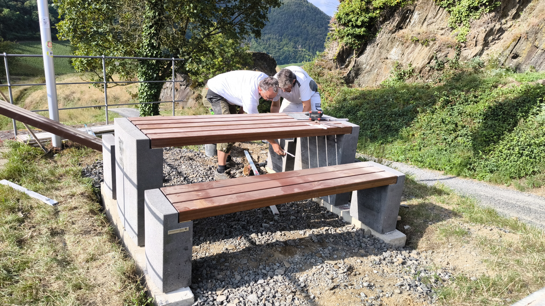 Am Samstag, 24.08.2024 war es soweit, die vierte Sitzgruppe wurde auf der Saffelnburg hoch über Mayschoß fertiggestellt. Diesmal waren die Weiberner Steinhauer Helmut Reuter, Egon Schumacher und Klaus Hilger vor Ort. Nun können Wanderer den atemberaubten Ausblick auf der Saffenburg noch besser genießen.